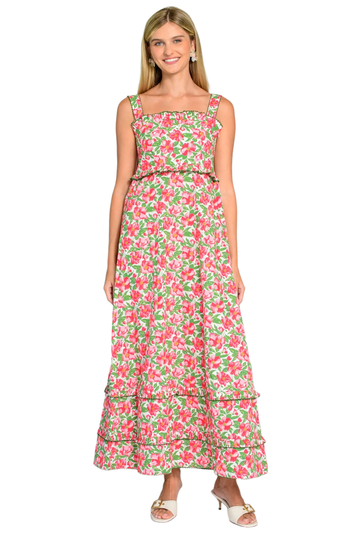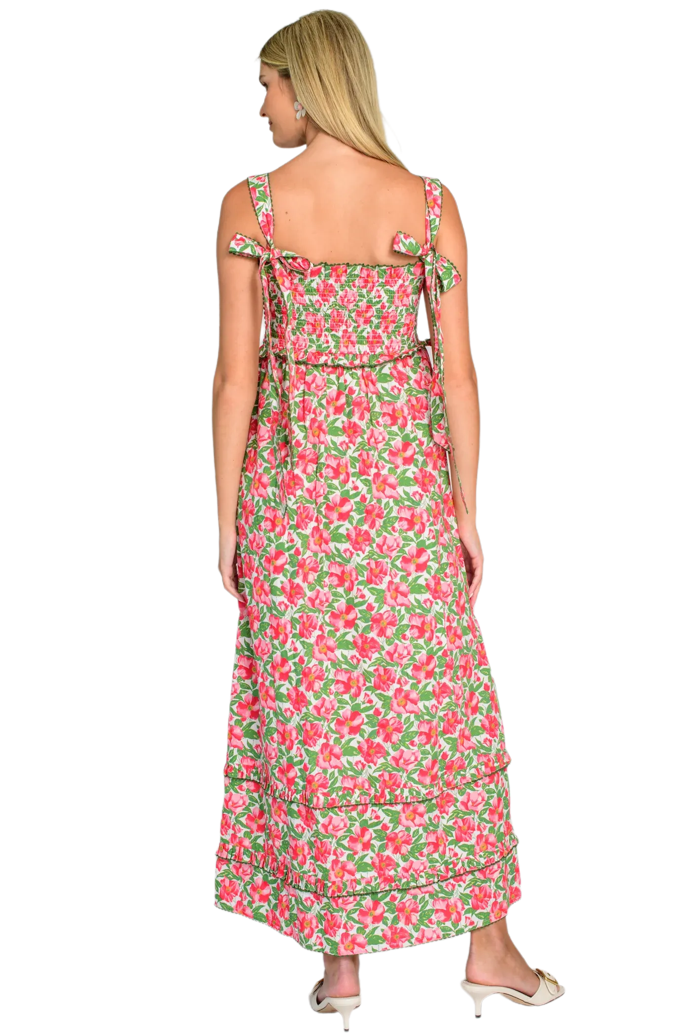Pippa is a sweet new maxi dress style featuring self tie straps, an A-line skirt, mini pleated ruffle details, and picot trim. With a flattering silhouette and darling floral print, she is perfect for any graduations, rehearsal dinners, or showers you're attending this Spring.