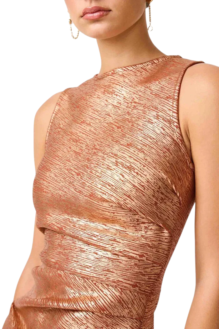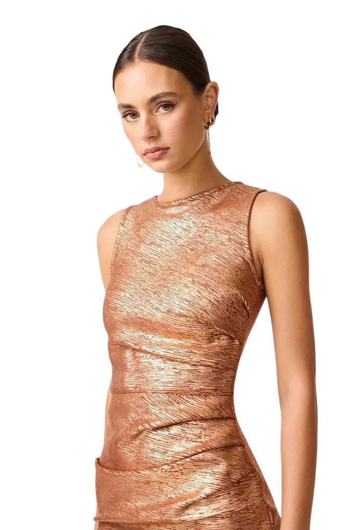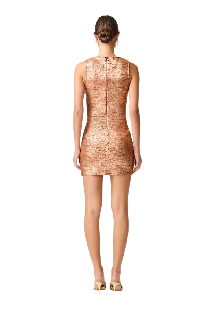The silhouette features a high neckline for a clean, contemporary finish, balanced by subtle waist tucks that add soft ruching and shape through the midsection. The fitted cut enhances your natural curves, while the mini length makes it the perfect statement piece for nights out, cocktail events, or elevated day dressing.