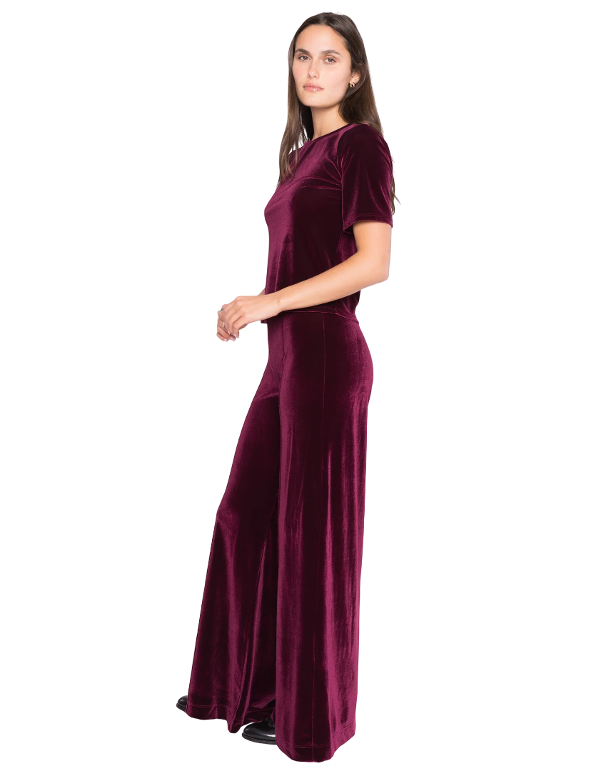 The iconic Ripley Rader Perfect Pant, now in luxurious stretch velvet knit. This high-waist, wide-leg silhouette delivers the appearance of a structured, tailored look with the comfort of a soft knit. The exaggerated wide leg and elongated rise flatter every shape, creating a look that’s both sophisticated and effortlessly comfortable.