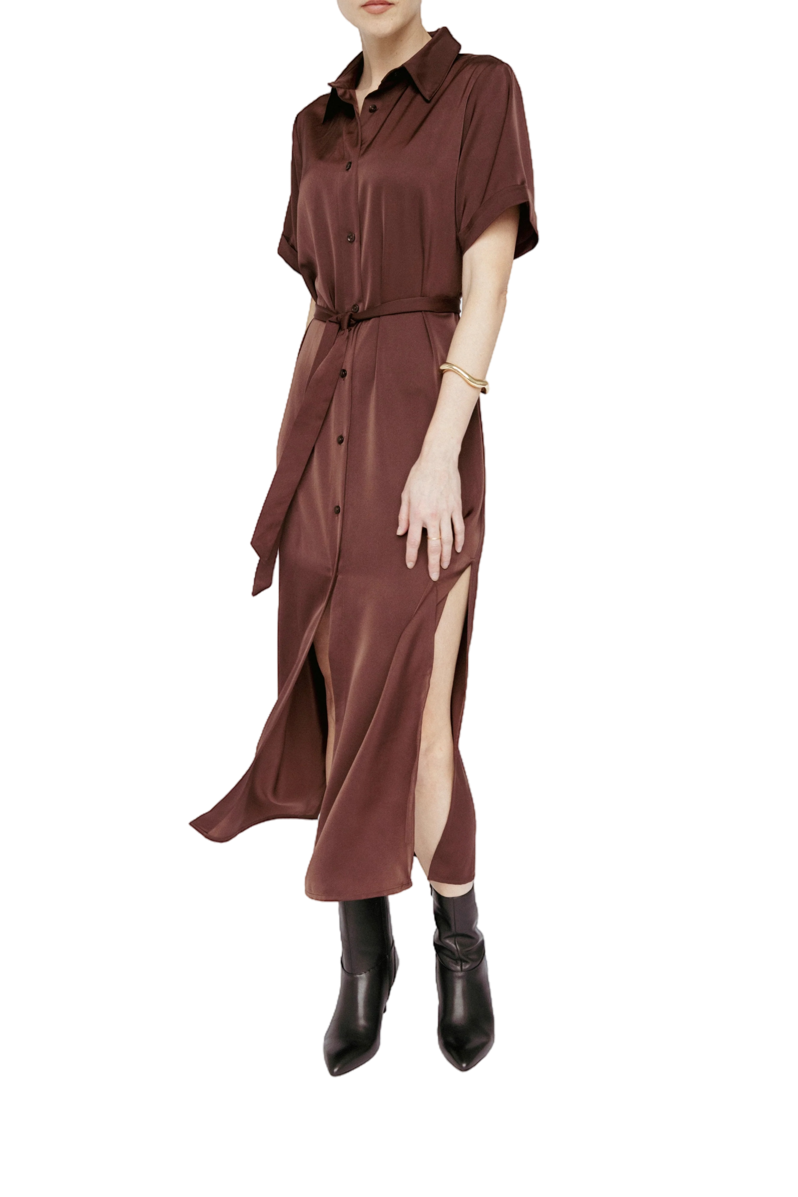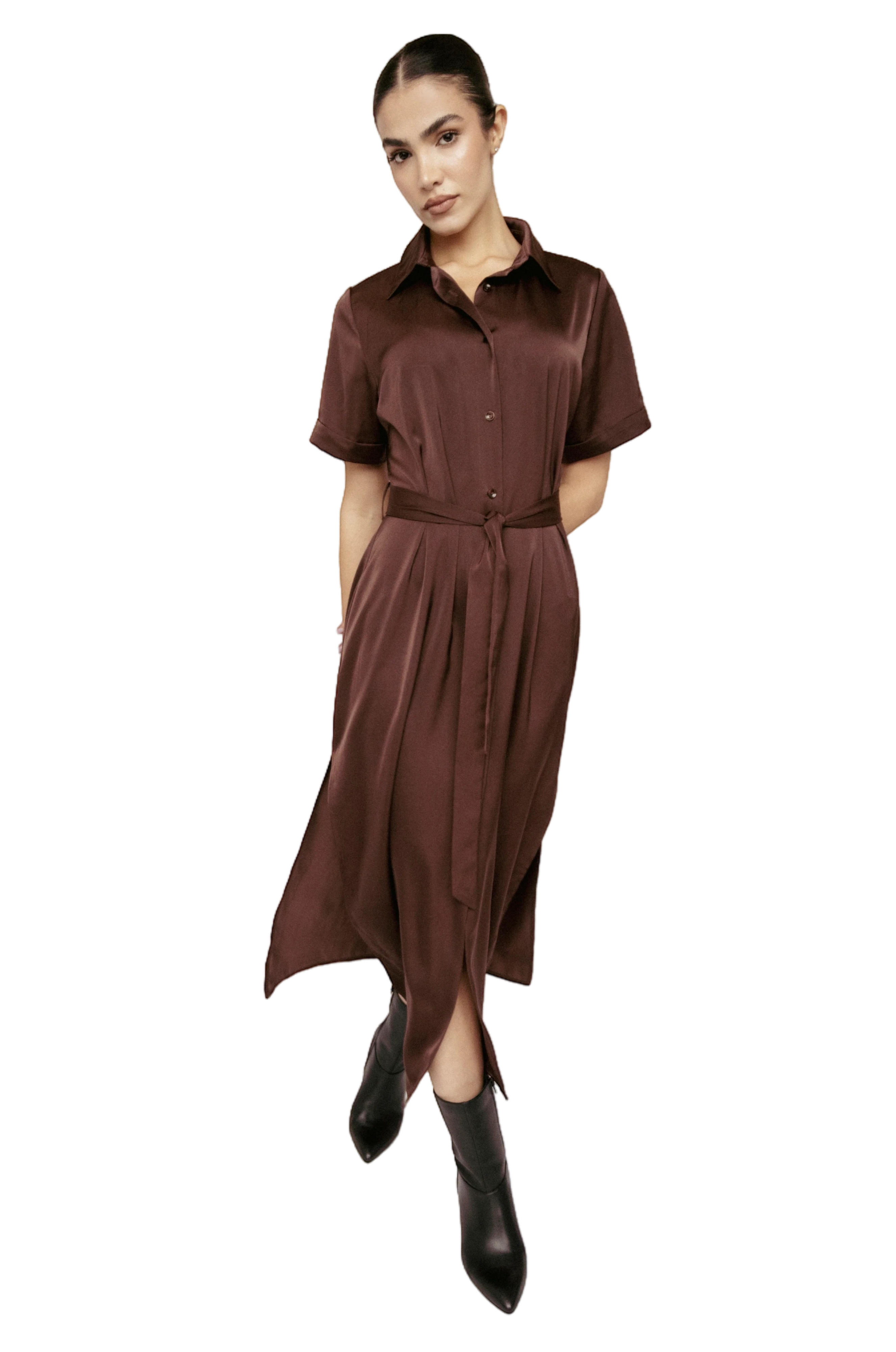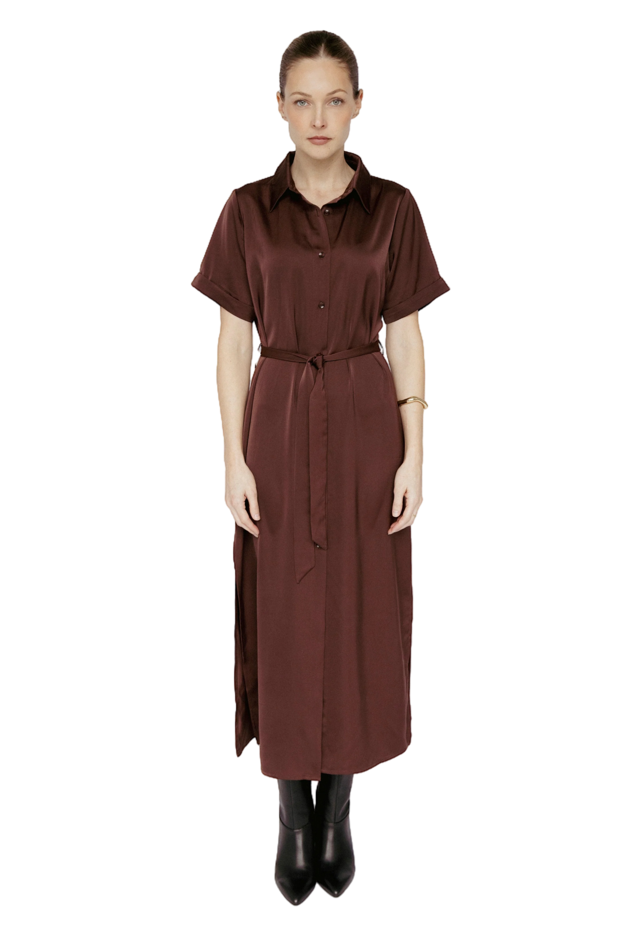 A timeless shirt dress silhouette reimagined in our signature Butter Satin. Designed with effortless t-shirt sleeves and a clean button front, it features a detachable waist tie for a cinched or relaxed fit. Side slits add movement and a touch of drama, making this piece an understated yet striking choice from day to evening.