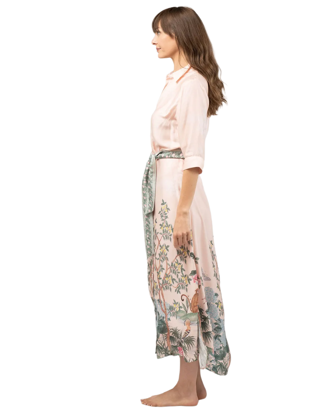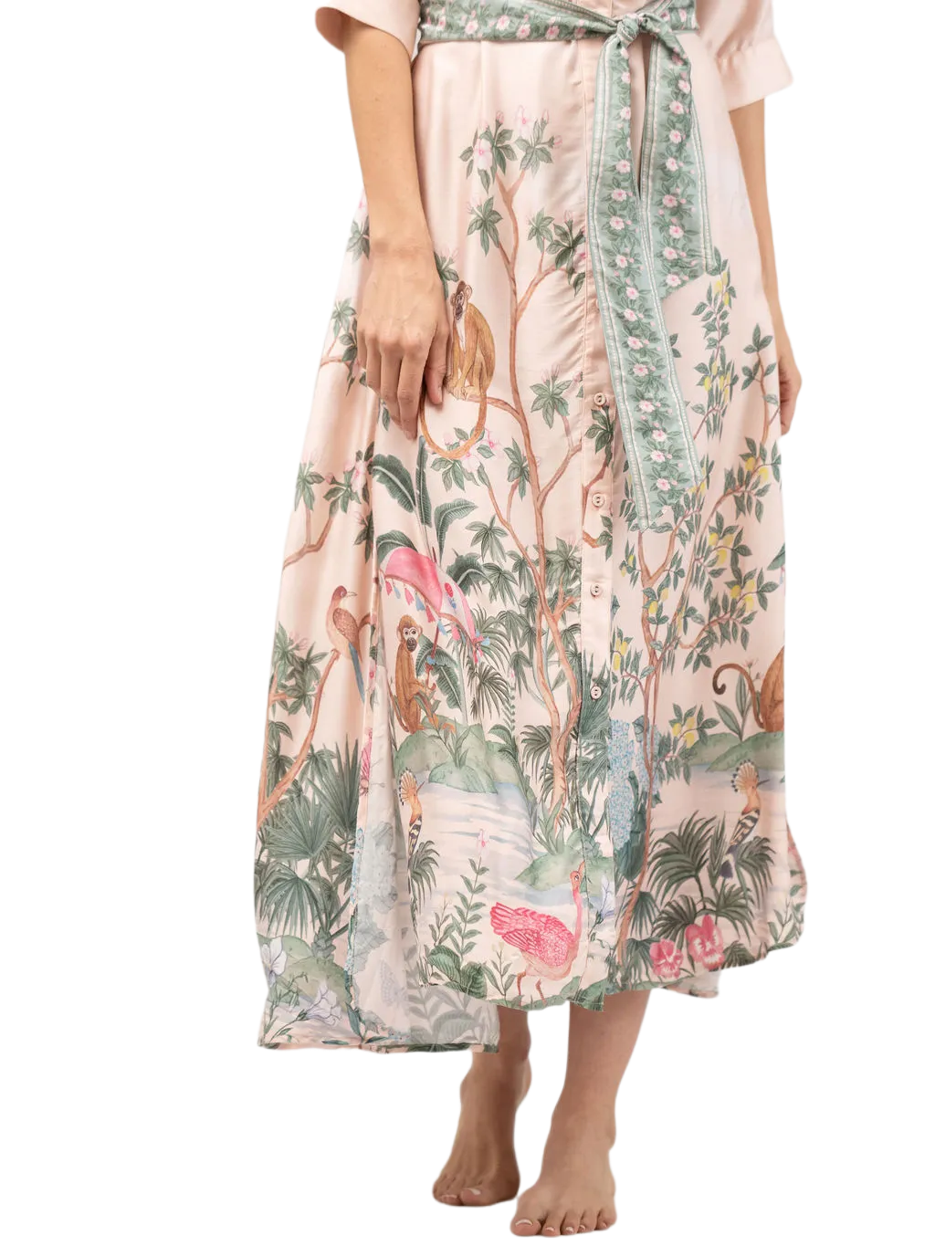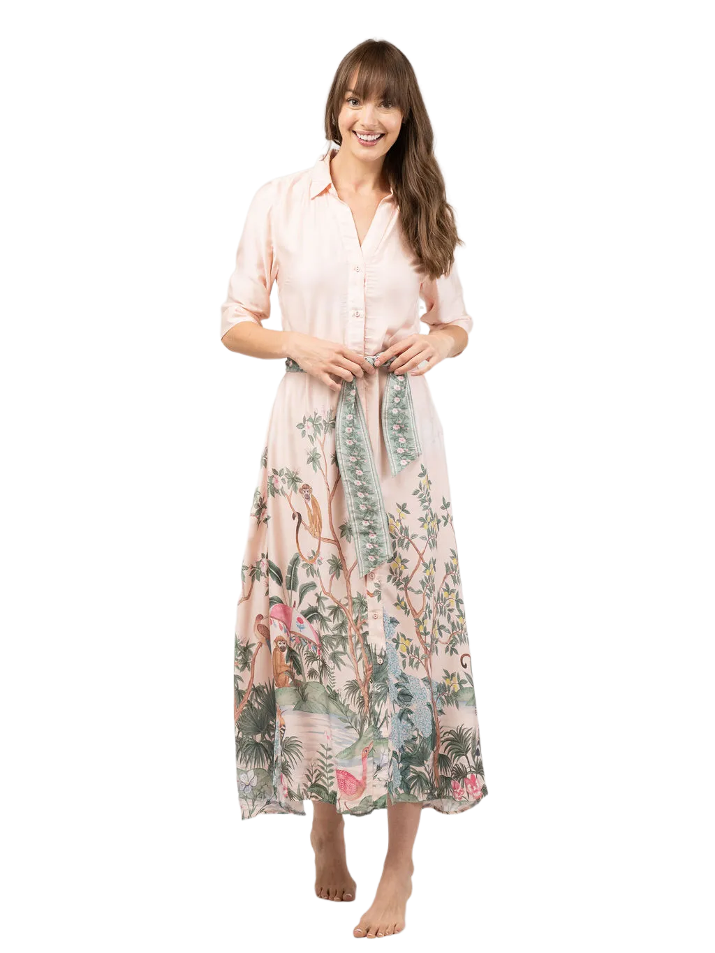 Effortlessly elevate your style with The Eloise Dress. The classic design includes a button up bodice, quarter length sleeves, and an optional tie waist for a timeless silhouette. Featured in our new Monkey See print. Perfect for everyday wear.