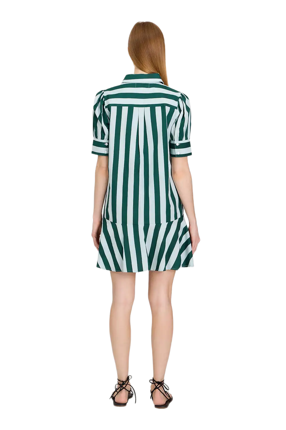 The Liv Dress is a playful mini dress with a tailored bodice and a relaxed drop-waist silhouette. It features short puff sleeves with cuff detailing, a classic shirt collar, and a partial button placket down the front. The skirt is finished with a flounced hem for a feminine, swingy shape.