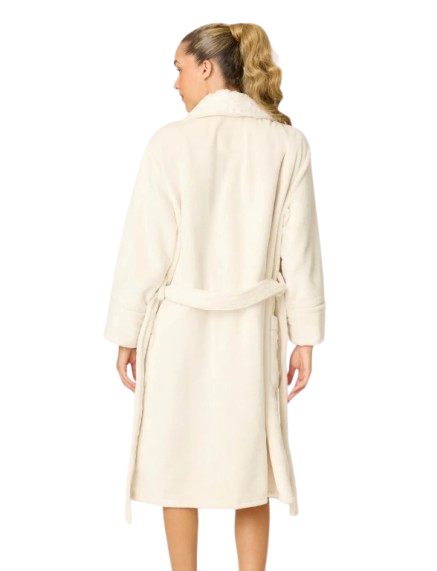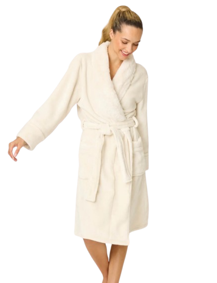 Wrap yourself in cozy, plush comfort. This mid-length robe is made from silky-soft fleece with a shawl collar, a self-tie belt, and roomy patch pockets. A warm sand base with subtle leopard spots brings playful polish to every cozy moment.