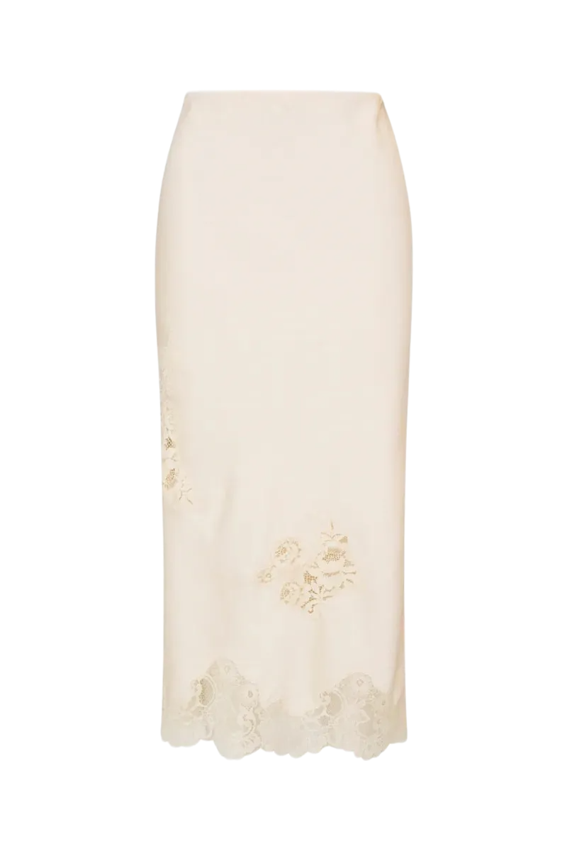 The Vivia Skirt is a romantic new midi crafted in our luxe satin crepe fabric with a subtle sheen and beautiful drape. Designed with an easy pull-on fit and hidden elastic waistband, this longer-length silhouette floats effortlessly with every step. A wide scallop lace trim at the sweep lends a boudoir-inspired touch, while delicate floral lace appliqués add our signature LoveShackFancy look.