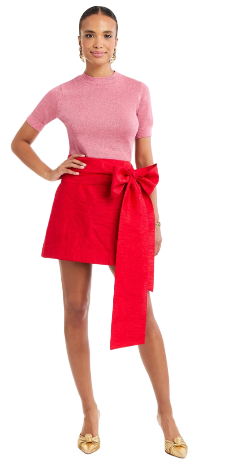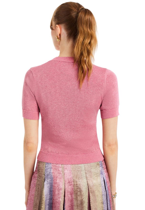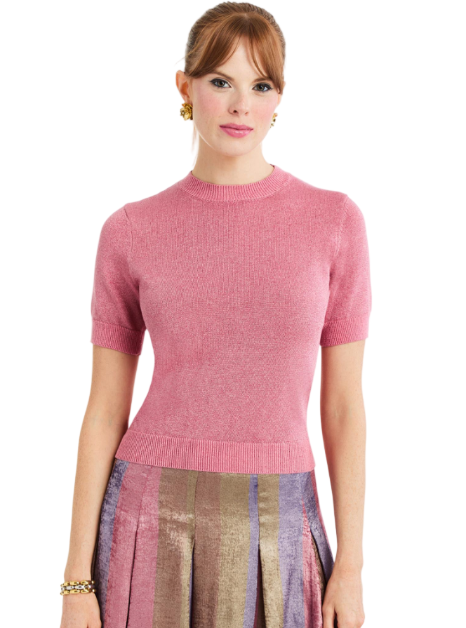 The Drew Crew-Neck Sweater in Gilded Pink is a versatile knit that adds a touch of shimmer to everyday dressing. Crafted in a metallic blend, this short-sleeve sweater features a classic crew neckline and ribbed finishes for a polished fit. Pair it with trousers or skirts for a chic, day-to-night wardrobe staple.