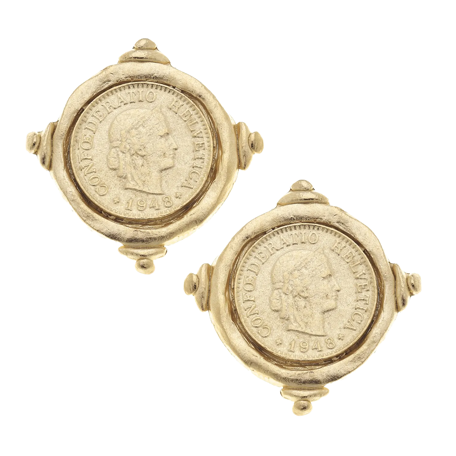 Swiss franc coin intaglio stud earrings. This 1948 coin is inscribed with CONFŒDERATIO HELVETICA, the Latin name for the Swiss Confederation. With the combination of sophistication and elegance, these earrings carry a historic look that will always be in style.