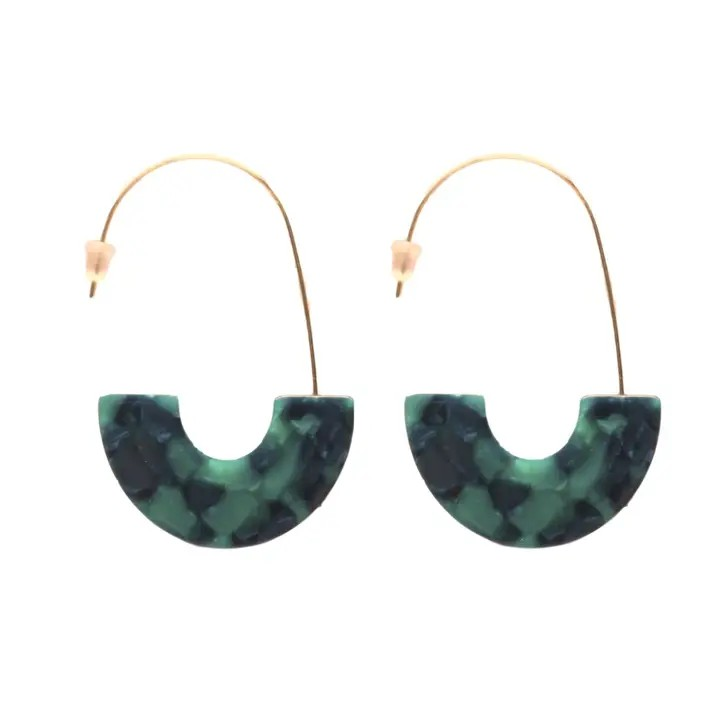 These earrings feature a half moon shaped resin tortoise shell mold affixed with an ultra long "thread through" post. 2.2 inches long and 1.5 inches wide (half moon bead - end to end). "Slip on" thread style hoop earring with an ultra long post and spotty tortoise shell resin "half moon" bead.