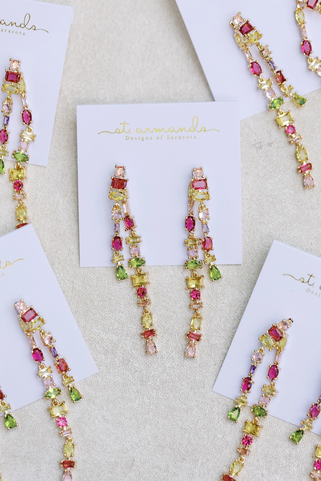 Our Layered Duster Earrings are adorned with jewel-toned rhinestones in an array of shapes and colors. These earrings showcase a blend of pink, olive green, purple, and yellow stones, creating a vibrant and sophisticated look that is perfect for Fall and Holiday. The lightweight style is 3” in length.