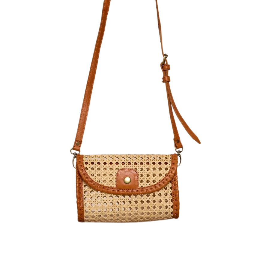 Brown cane weave convertible clutch and crossbody with removable crossbody strap and snap closure. 9 x 6 x 3.5 in.