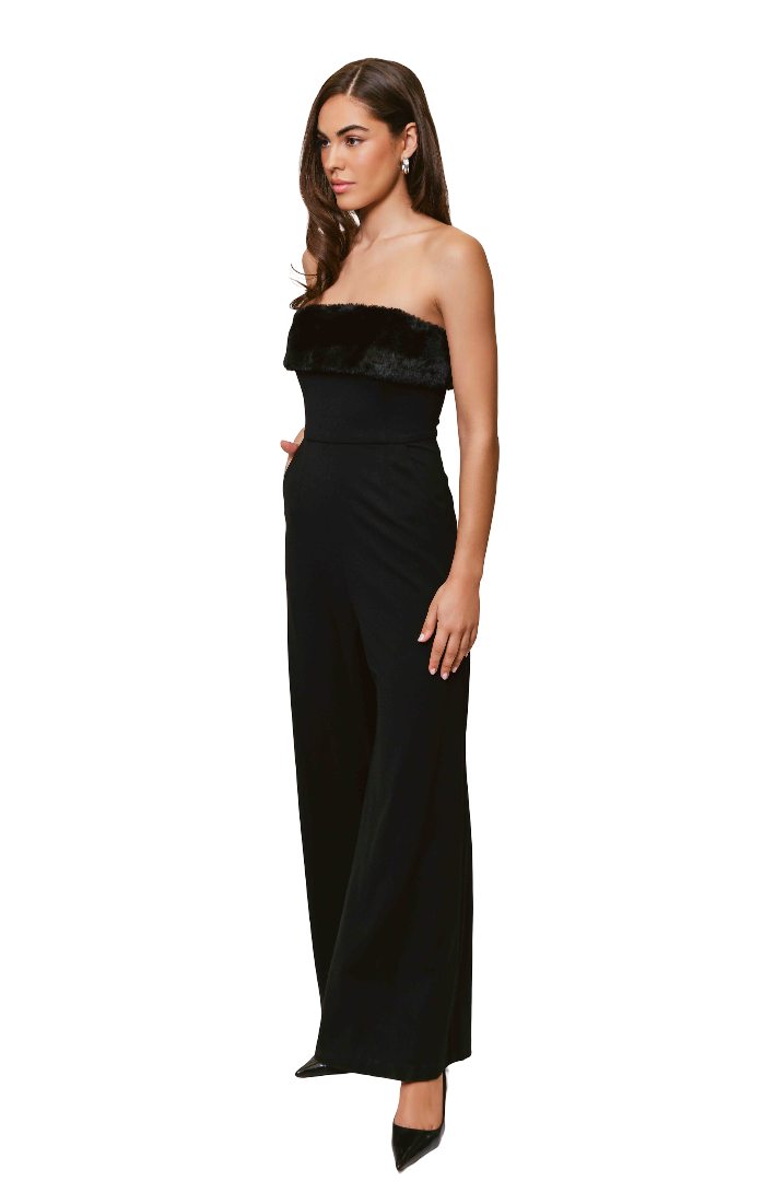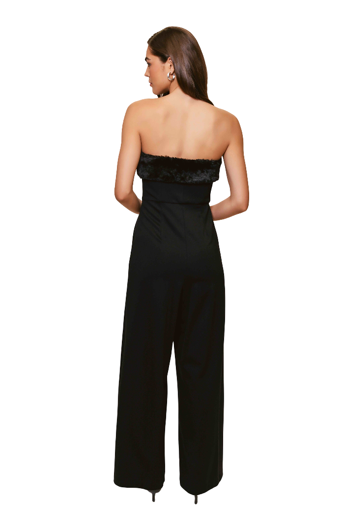 Make a statement in this black jumpsuit with plush fur detailing at the top. Elegant, edgy, and effortlessly cool — this one-piece is your go-to for nights out or special occasions.