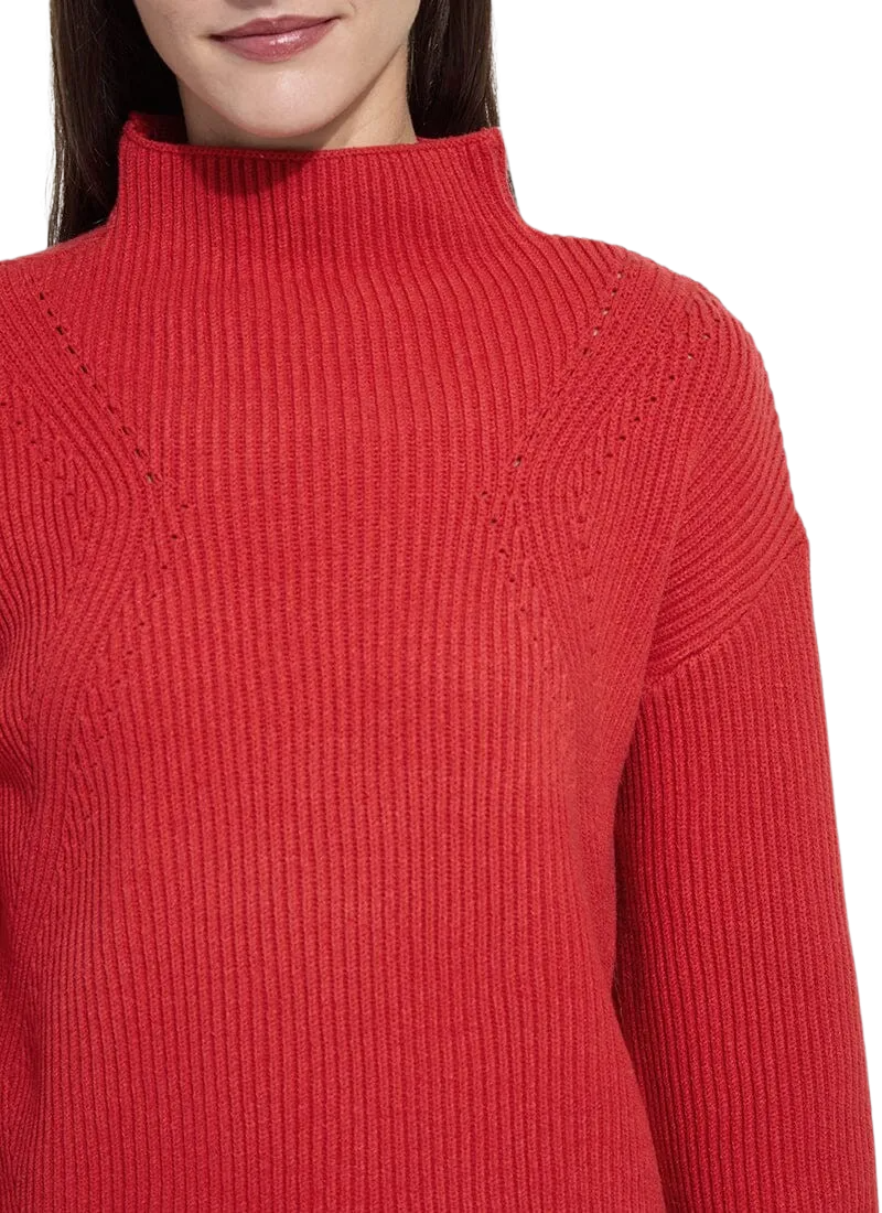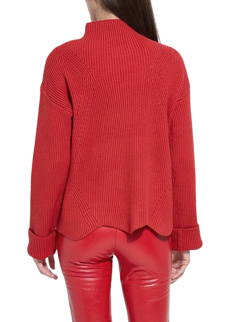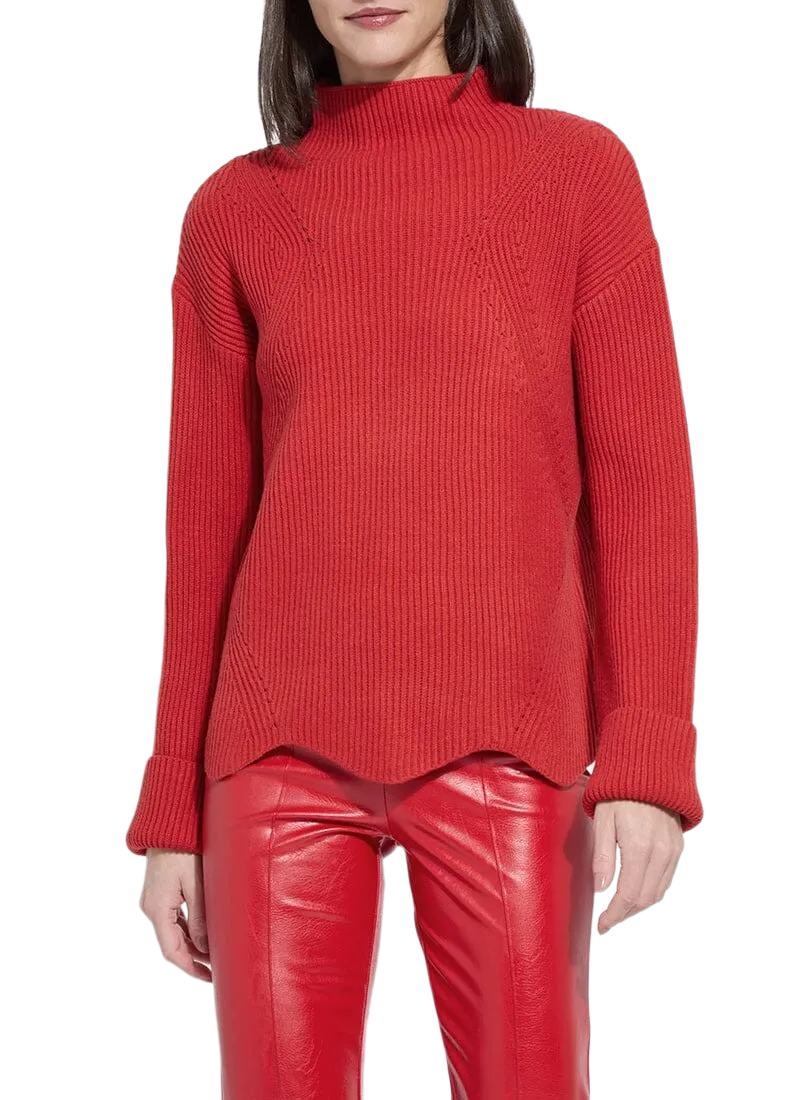 The Hyacinth Cozy Rib Scallop Edge Pullover is a fully fashioned sweater with a funnel neck, drop shoulders, cuffs, relaxed fit and scalloped hemline. Partner this cozy sweater with the Hi Waist Vegan Leather Wide leg and ankle boots. Store folded, never hung.