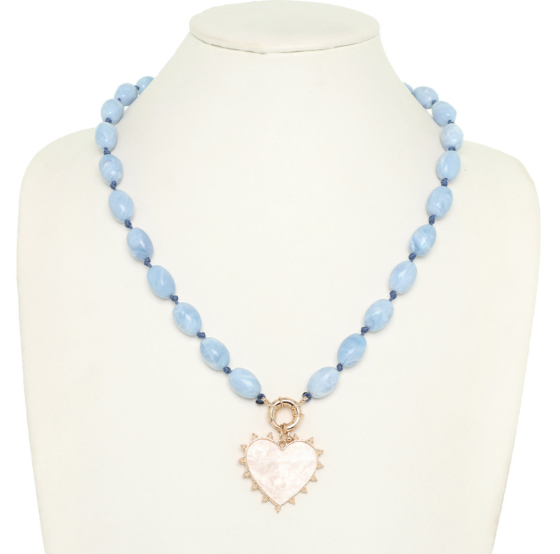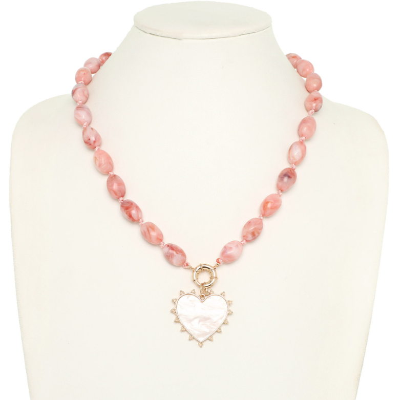 PEARLESCENT HEART PENDANT MARBLED BEAD NECKLACE WITH GOLD TONE METAL ACCENTS