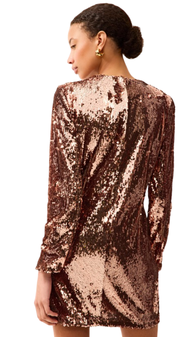 Made for the life of the party, this long-sleeve mini dress catches the light with every move. Clean, modern lines meet an all-over wash of rose gold sequins, creating a look that’s equal parts polished and playful.