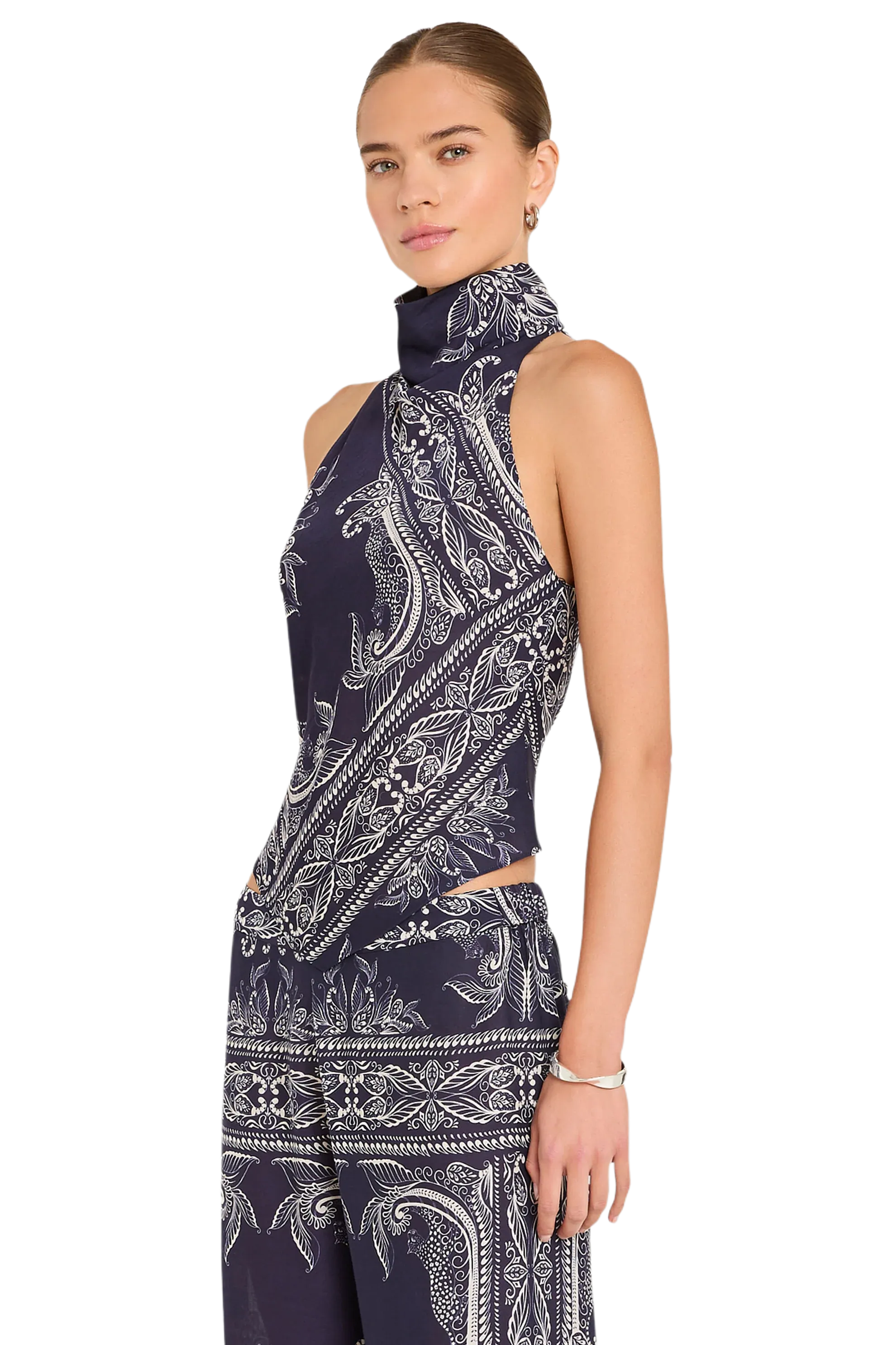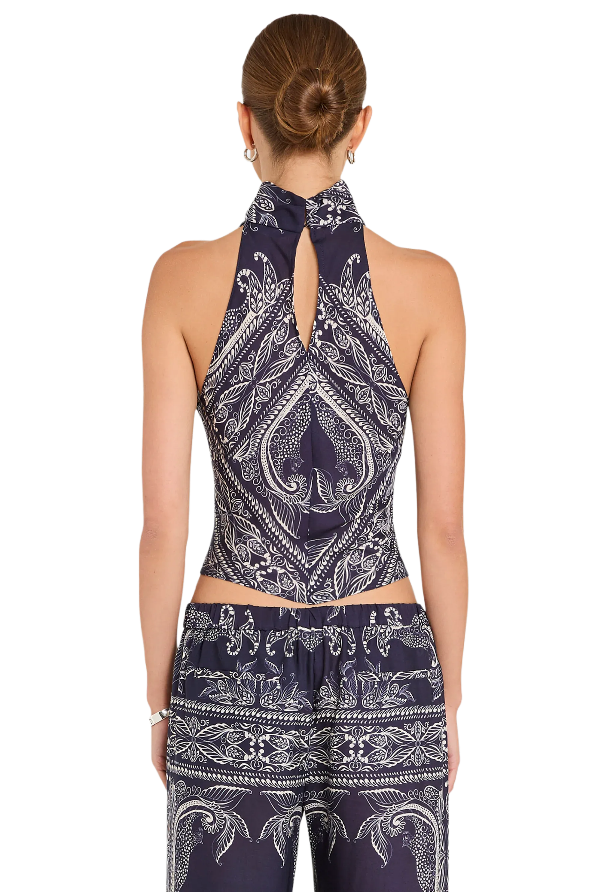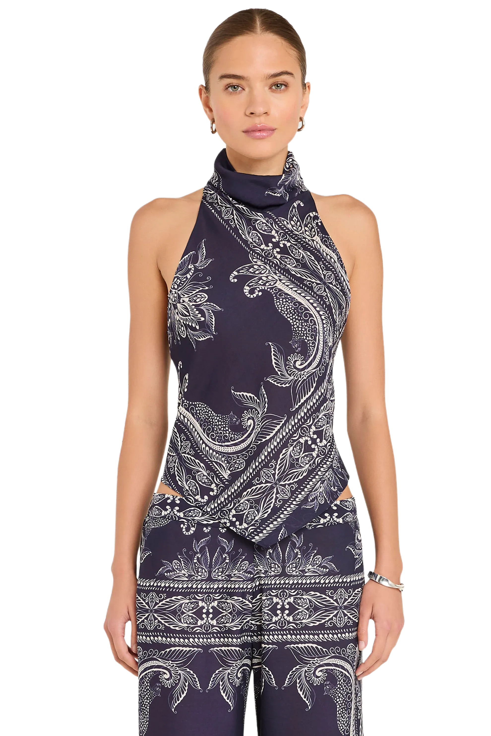 Set the mood in the Arielle Top. This bandana-print halter brings playful energy and charm to any outfit. Complete the set with the matching Arielle Pants and wedge sandals for a vacation-ready look.