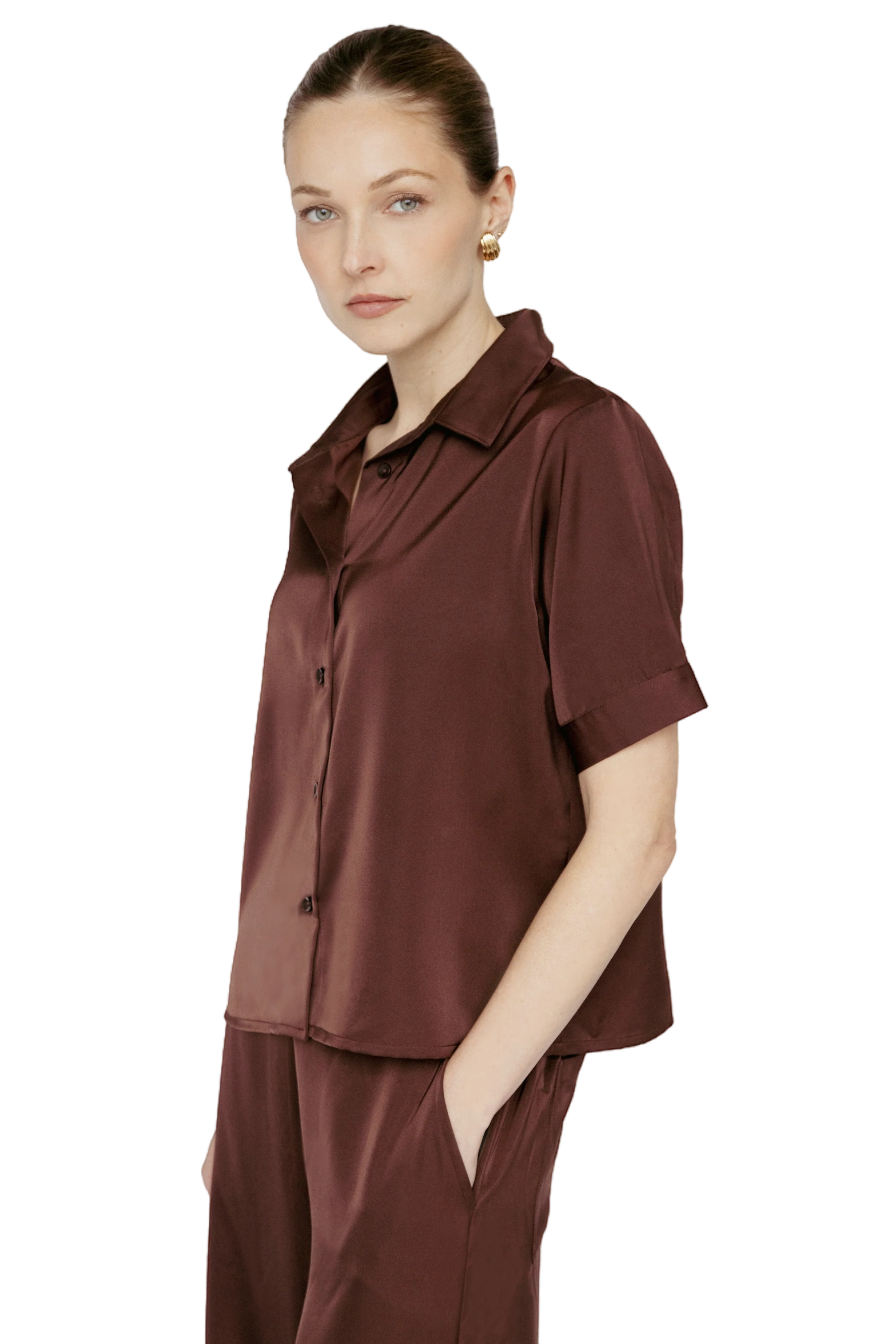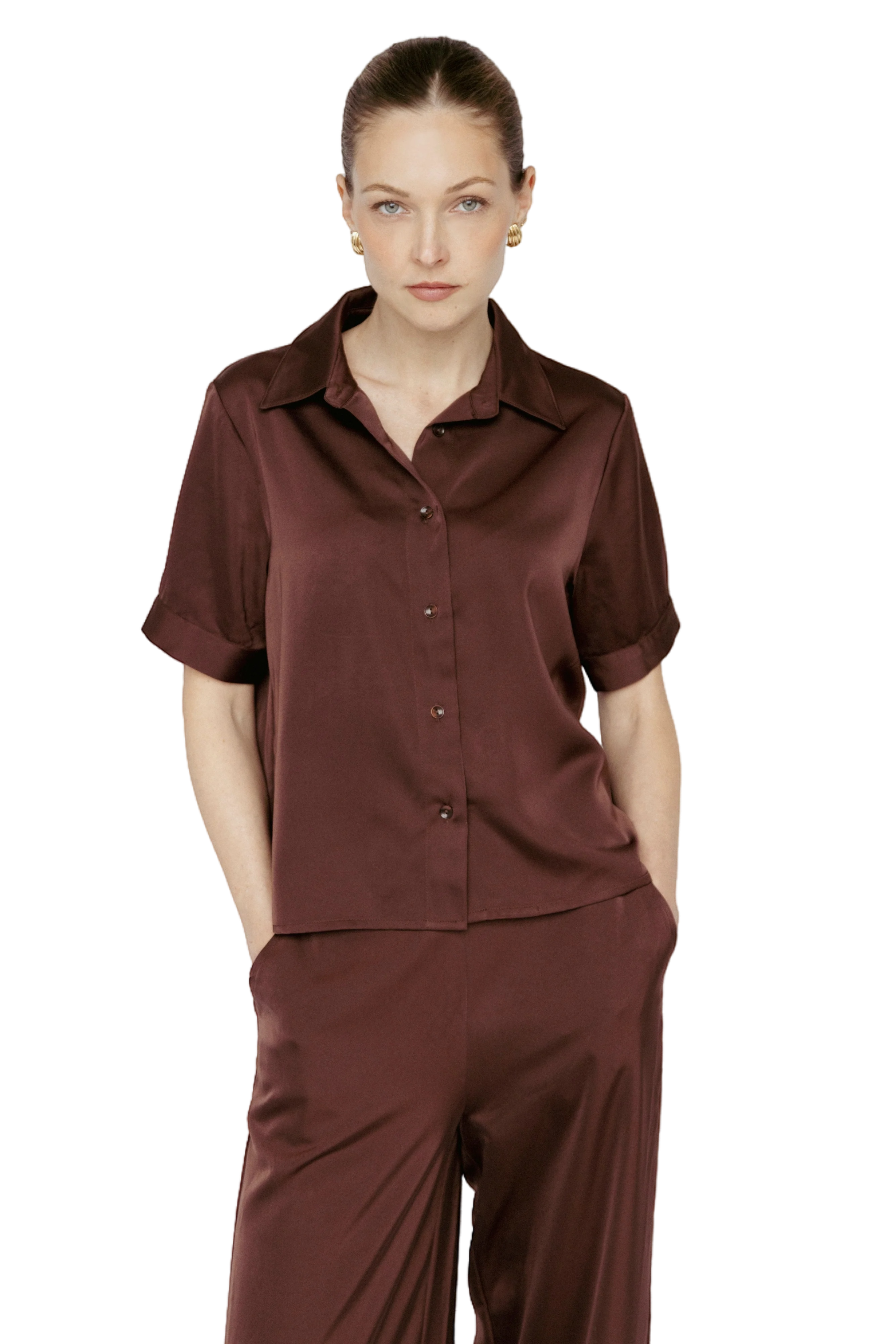 A timeless essential, this button-front blouse is crafted from Amanda Maria's signature Butter Satin for a soft, fluid drape with subtle sheen. Designed with a classic turn-down collar and t-shirt length, it’s a versatile piece that transitions effortlessly from day to night.