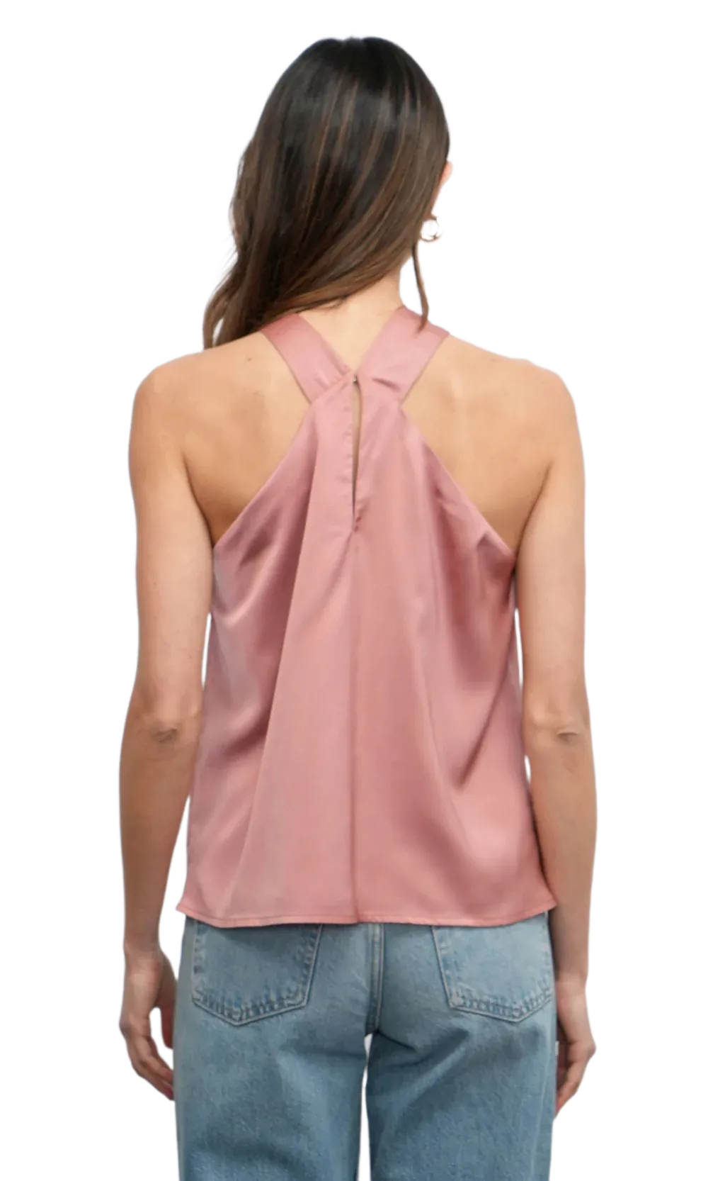 Crafted from luxurious, smooth satin fabric in a rich "clay" hue, this top drapes beautifully, offering a sophisticated sheen. It features a chic halter neckline that ties gracefully at the nape of the neck, leading to an alluring open back design.
