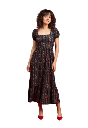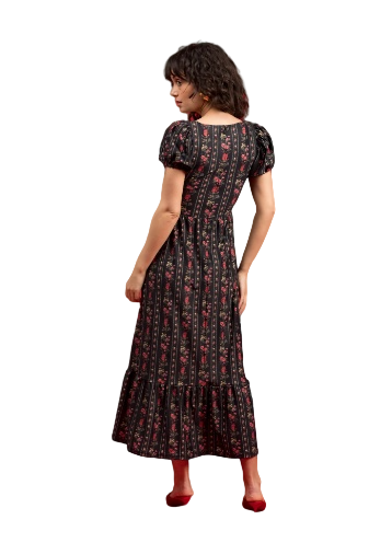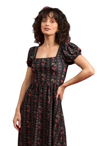 Think of it as everyday Bridgeton wear. The faux Boning in bodice looks great and feels even better. With a figure flattering shape and a gorgeous bottom tier. Oversized Puff Sleeves make this midi dress a fan favorite.
