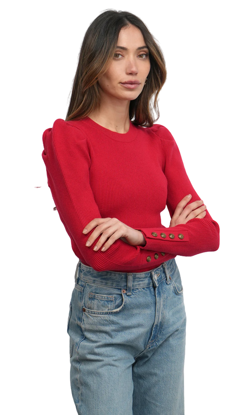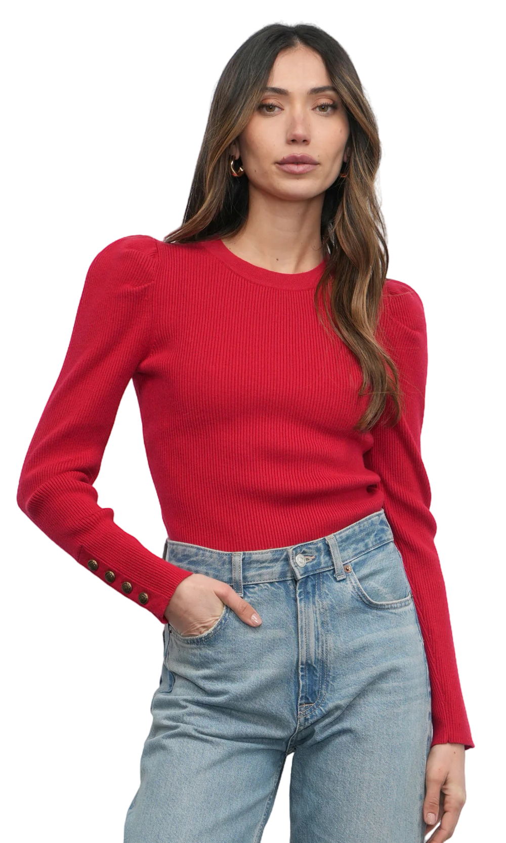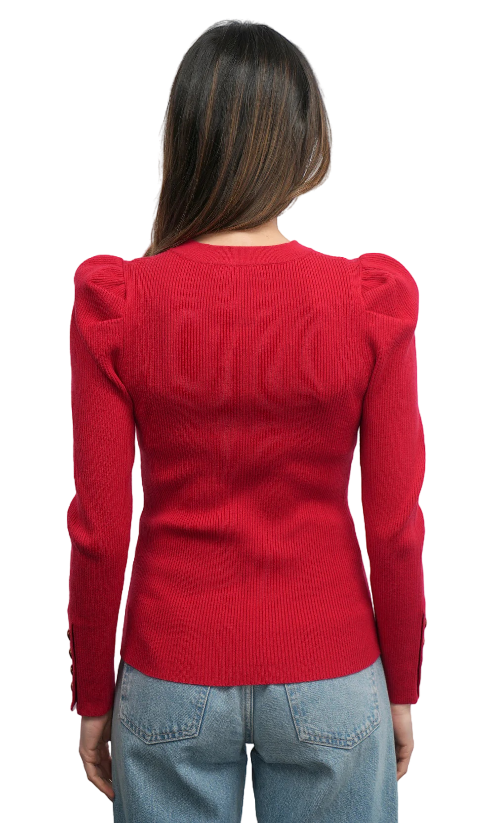 This top is crafted from a comfortable ribbed knit fabric in a vibrant red color. It features a button-front closure and unique puff sleeves that add a touch of romance and volume. The cropped fit and ribbed texture create a fashionable and form-fitting look, making it a perfect piece for both casual and dressier occasions.