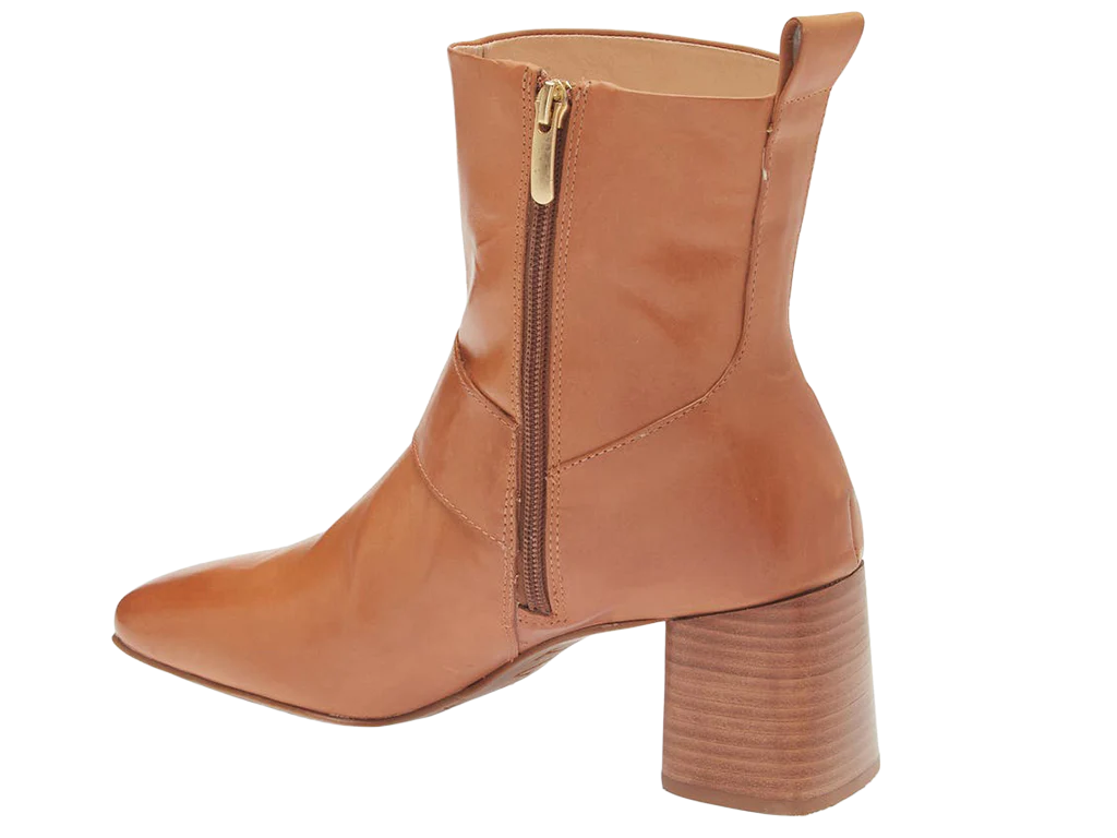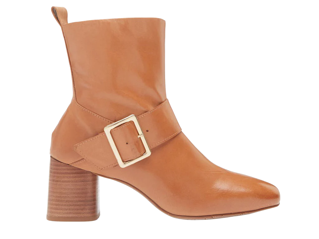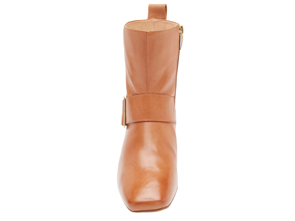 This mid-calf bootie features leather upper and lining, a side zipper, and a 6-inch shaft. It includes a buckle detail, a 2 1/2-inch heel with a durable rubber outsole.