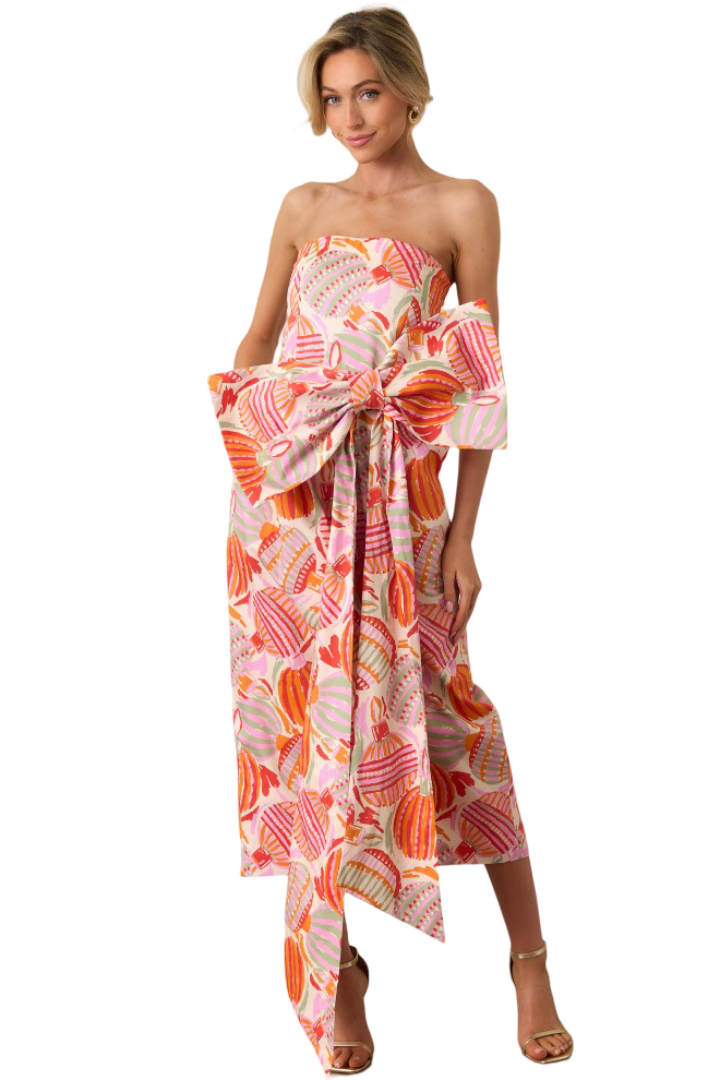 The Lisette Midi Dress is designed to make an entrance. With its strapless neckline and dramatic oversized bow, it strikes the perfect balance between timeless femininity and modern sophistication. The fluid satin fabric drapes beautifully, creating movement that feels as effortless as it looks striking.