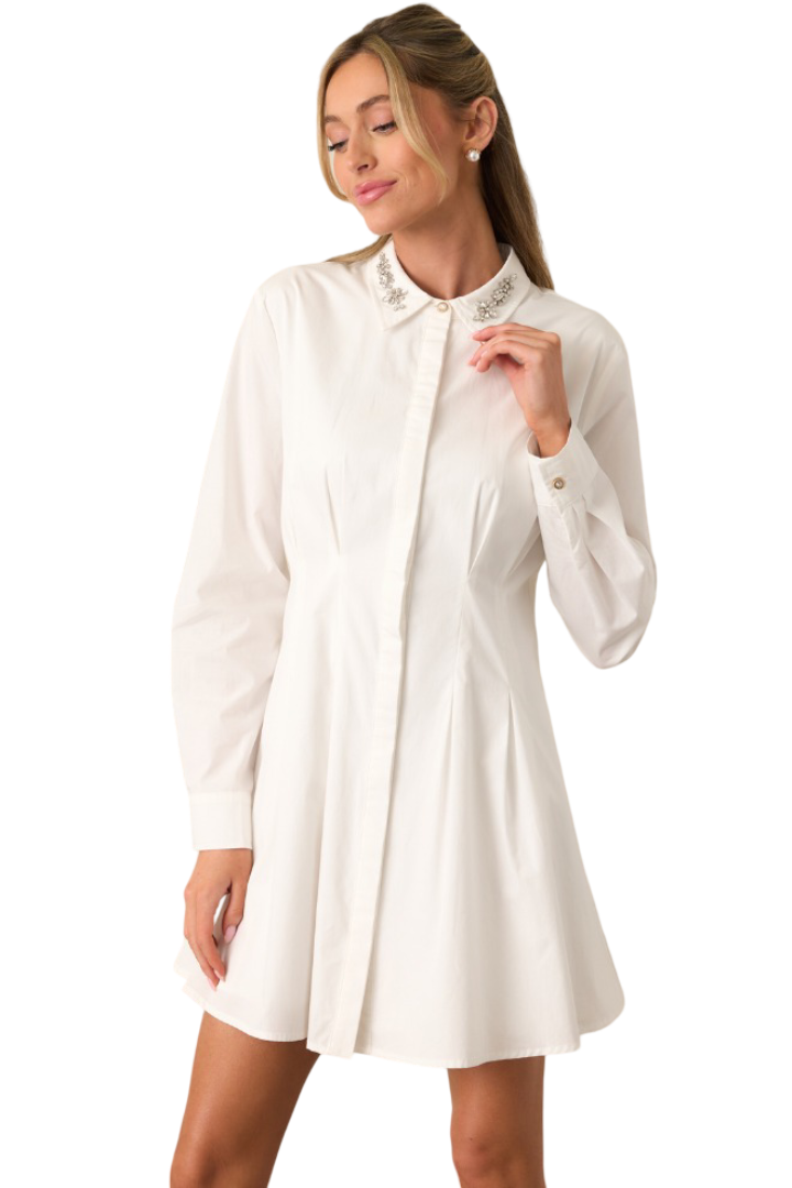 The Renee Jewel Neck Dress redefines modern femininity with its classic shirt-dress shape and subtle sparkle. The jeweled collar adds just the right amount of shine, while the flared skirt gives it graceful movement. It's timeless, tailored, and ready for every occasion.